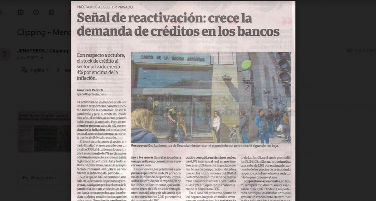 La actividad de los bancos suele ser un buen termómetro para medir cómo funciona la economía: desde la pandemia, y pese al rebote del PBI de este año, el crédito al sector privado había estado planchado. Pero en noviembre pegó un salto de 4% por encima de la inflación del mes a nivel general, un crecimiento que no se veía desde abril del año pasado.