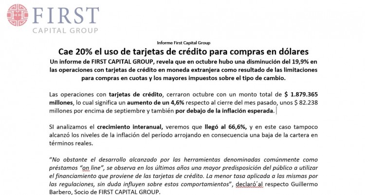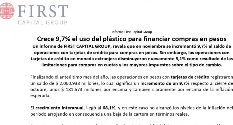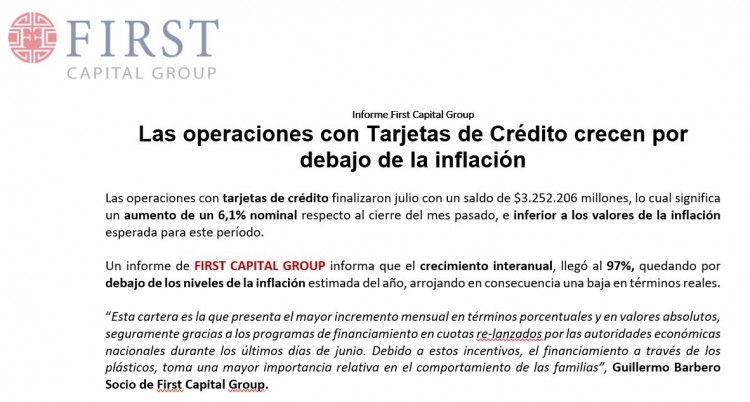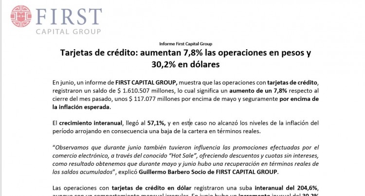 Un informe de First Capital Group aseguró que las operaciones con tarjetas de crédito alcanzaron los $ 14,2 billones, lo cual significa una suba de un 6,3% nominal respecto al cierre del mes pasado, claramente por encima de los valores de la inflación esp