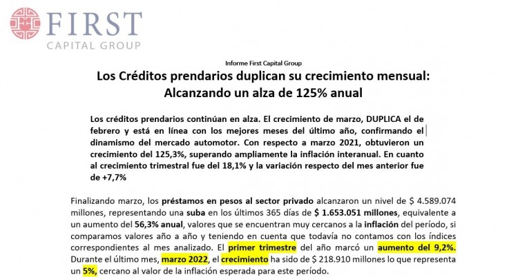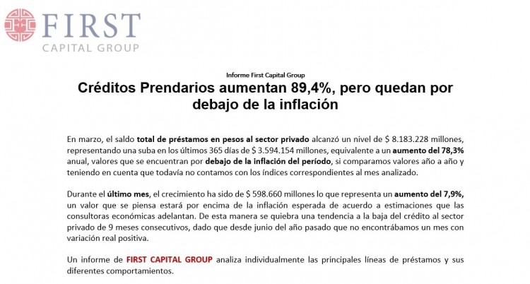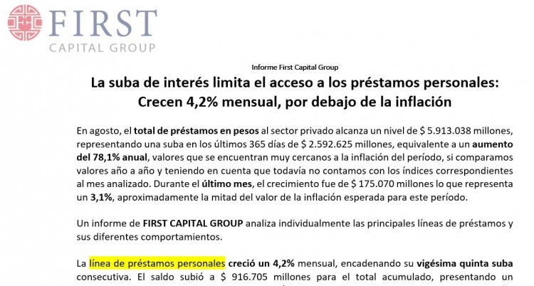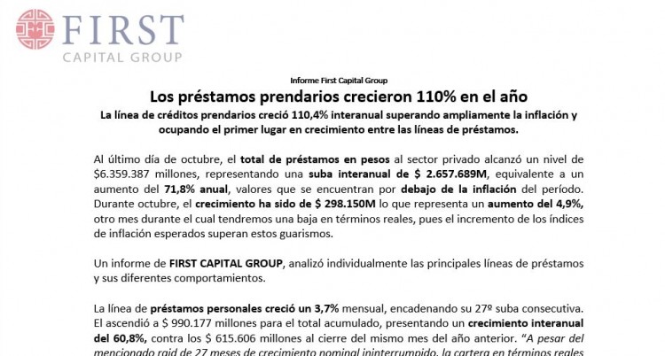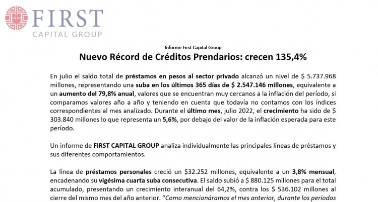 Según un informe realizado por FIRST CAPITAL GROUP, la lÃnea de créditos prendarios experimentó un importante crecimiento durante el mes de agosto de 2024. El saldo de la cartera alcanzó los $2.127.256 millones, lo que representó un incremento mensual del