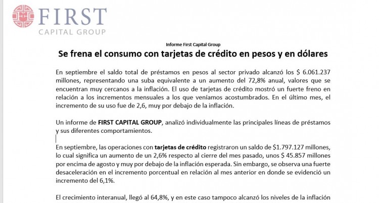Un informe de First Capital Group explica que las operaciones en pesos con tarjetas de crédito subieron en términos nominales un 3,4% mensual en septiembre y el saldo llegó a $21,6 billones para el total acumulado, presentando un crecimiento interanual...