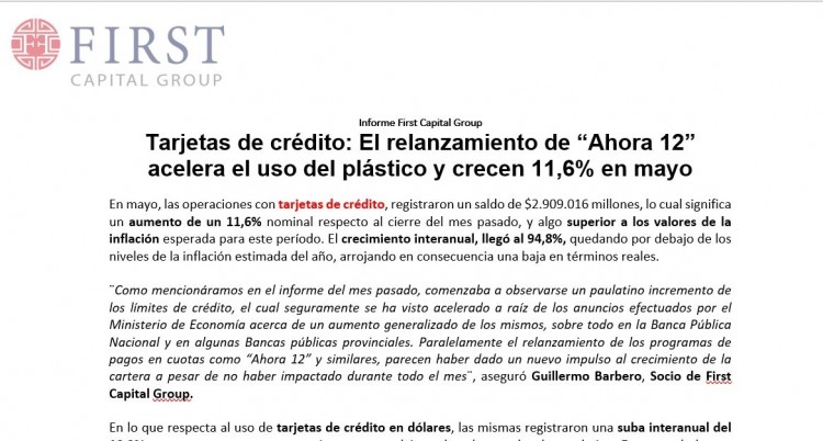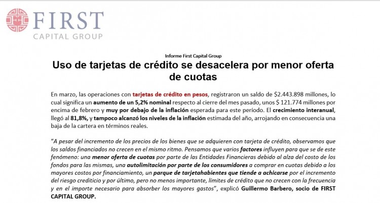 Un informe de FIRST CAPITAL GROUP, indica que en abril, las operaciones con tarjetas de crédito en pesos registraron una suba nominal de un 7,1% mensual, el saldo llegó a $18,7 billones para el total acumulado, presentando un crecimiento interanual del 15