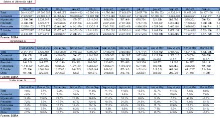 En febrero, el saldo total de préstamos en pesos al sector privado alcanzó un nivel de $ 60,4 billones, representando una suba en el último mes de $2,8 billones o sea un 4,9%, mientras que en los últimos 365 dÃas el incremento alcanza los $ 41,4 billones,