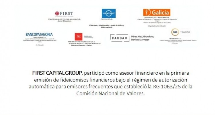 El viernes 27 de julio desde FIRST CAPITAL GROUP, participamos como asesores financieros en la primera emisión de fideicomisos financieros bajo el régimen de autorización automática para emisores frecuentes que estableció la RG 1063/25 de la Comisión Naci