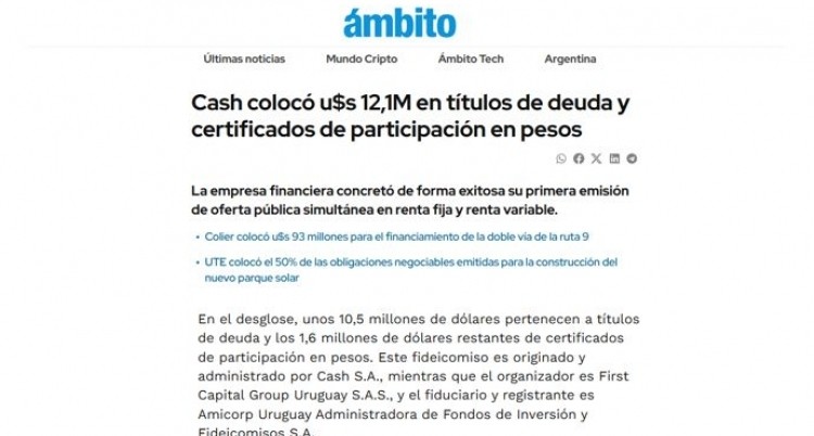 La empresa financiera Cash colocó 12,1 millones de dólares en títulos de deuda y certificados de participación en pesos a través de la Bolsa Electrónica de Valores del Uruguay (Bevsa), concretando exitosamente su primera emisión de oferta pública simultánea en renta fija y renta variable.