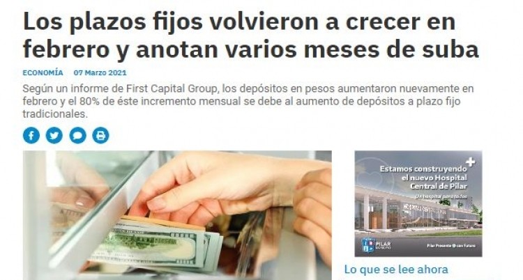 Según un informe de First Capital Group, los depósitos en pesos aumentaron nuevamente en febrero y el 80% de éste incremento mensual se debe al aumento de depósitos a plazo fijo tradicionales.