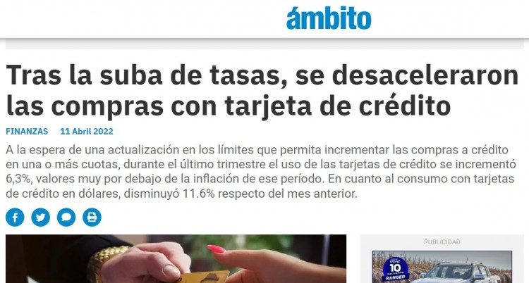 A la espera de una actualización en los límites que permita incrementar las compras a crédito en una o más cuotas, durante el último trimestre el uso de las tarjetas de crédito se incrementó 6,3%, valores muy por debajo de la inflación de ese período. En cuanto al consumo con tarjetas de crédito en dólares, disminuyó 11.6% respecto del mes anterior.