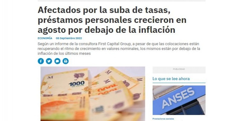 Los préstamos personales crecieron un 4,2% mensual en agosto y encadenaron su vigésima quinta suba consecutiva, aunque se ubicaron por debajo de la inflación esperada para ese mes afectados por la suba de tasas que convalidó el Banco Central en el octavo mes del año, según un informe de la consultora First Capital Group.