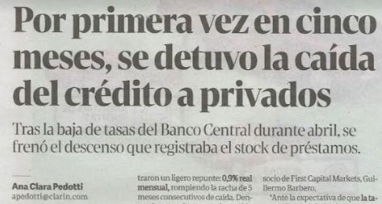 Aunque la actividad económica aún está lejos de mostrar signos de recuperación, el nivel de crédito al sector privado podría presentar una de las primeras luces amarillas. En abril, a partir de la profundización en la baja de tasas del Banco Central (BCRA), por primera vez en más de cinco meses consecutivos el stock de pesos prestados en los bancos detuvo su caída.