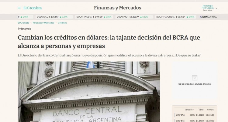 El BCRA eliminó la restricción que le impedía acceder a créditos en moneda a extranjera a aquellas personas que no perciban su sueldo en dichas divisas, tal como se había establecido desde 2016.