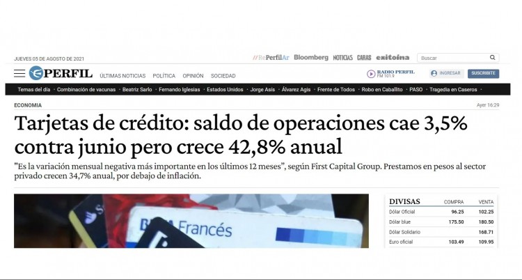 No obstante, el financiamiento al consumo con tarjetas de crédito verificó en julio un crecimiento de 42,8% interanual en un contexto de aceleración inflacionaria y mayor actividad dado que en igual mes de 2020 había una cuarentena más estricta.