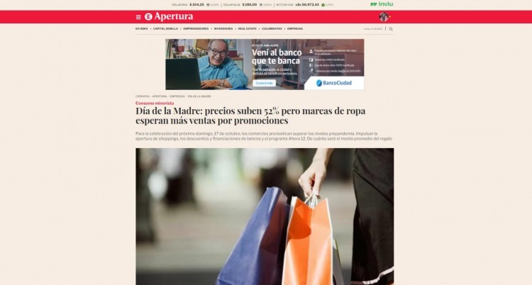 El próximo 17 de octubre se celebra el Día de la madre. Se trata de una de las fechas claves para las marcas de ropa, que esperan que, este año, las ventas superen los números pre-pandemia. "Ya vemos mucho movimiento, compras con mucha anticipación, lo que pronostica un octubre récord", sostuvieron desde la cámara que las agrupa.